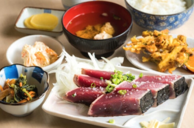 店のすぐ近くに市場があり、そこに水揚げされたカツオを使って、皆様に美味しいカツオ料理を提供しております。冷凍のカツオを使わないのもこだわり!肉類は一切使用せず、もちろん自慢の魚料理のみでメニューをそろえています。カツオは鮮度が落ちやすいため空気に触れる時間を最小限に抑え、遠方からご来店されるお客様には、特に一番おいしいカツオを味わっていただきたい漁師町の譲れないこだわりです。注文を受けてからカツオを捌き始めるので、混み合っている時間帯は、提供までかなりお待たせする場合もございますが、ココでしか味わえない鮮度抜群の地元で獲れた格別の生のカツオをご堪能ください。
